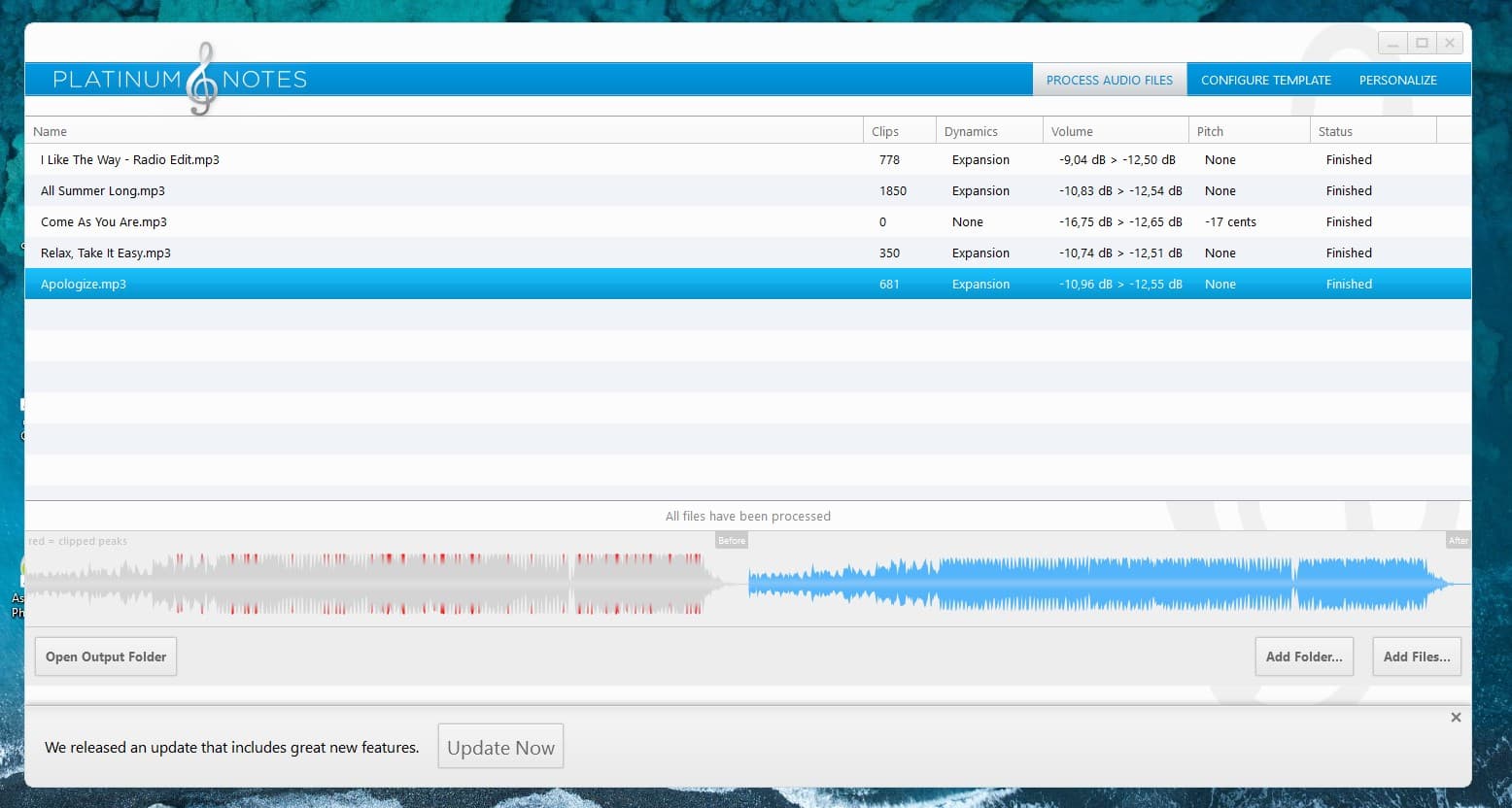 - Processar os ficheiros: O Platinum Notes irá analisar e melhorar as suas músicas de forma automática.