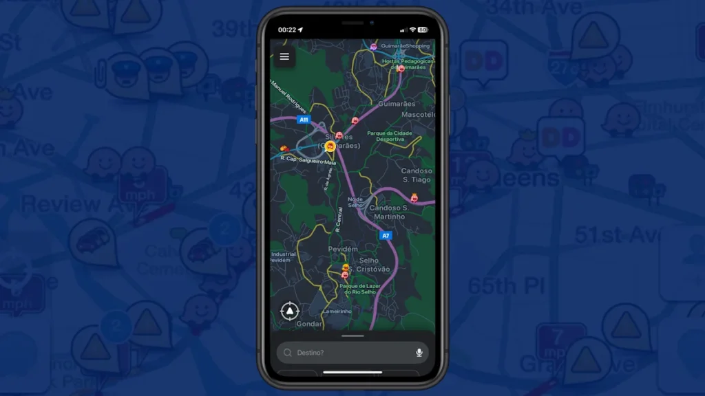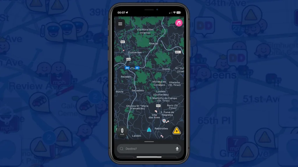 O ecrã inicial do Waze apresenta vários ícones que tornam a navegação mais simples e interativa: