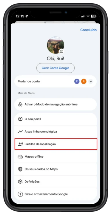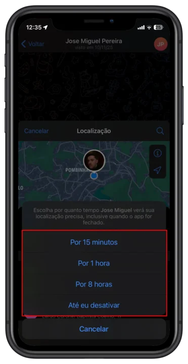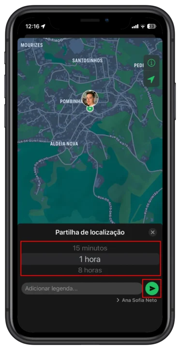 O destinatário verá a sua localização ao aceder à mesmo secção "Partilha de localização".
