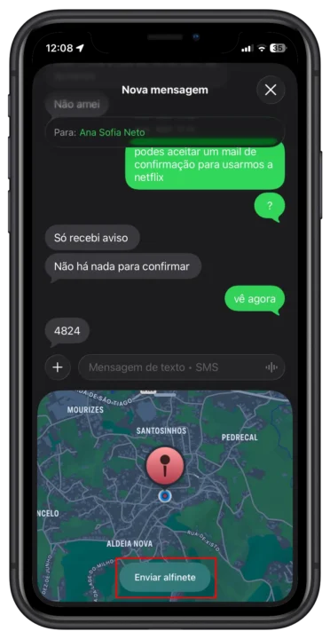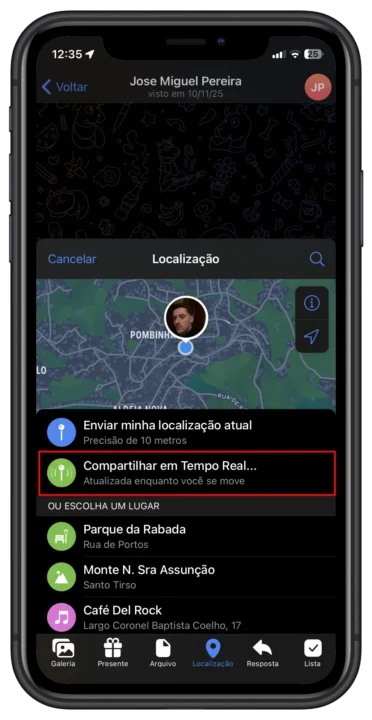 4. Após o envio, o destinatário receberá uma notificação. Ao clicar nela, poderá visualizar a sua localização em tempo real diretamente na conversa ou abrir a aplicação Encontrar para uma visualização mais detalhada.