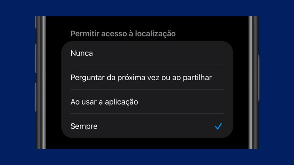 Para que uma aplicação possa partilhar a sua localização, necessita da sua autorização. Na mesma secção de Serviços de localização, encontre a aplicação que pretende utilizar (Mensagens, WhatsApp, etc.) e selecione a opção de acesso à localização. Para uma partilha contínua, as opções "Sempre" ou "Ao usar a aplicação" são as mais indicadas.