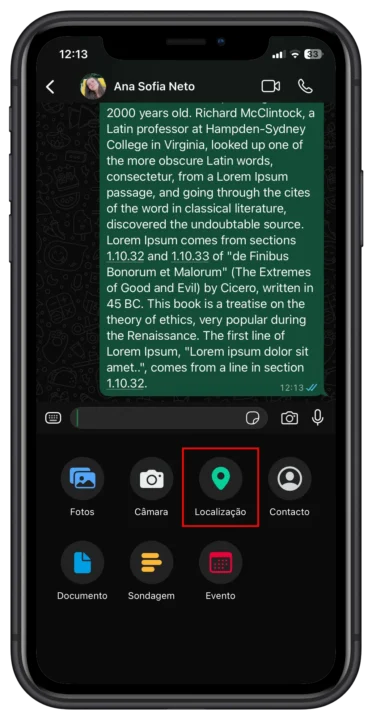 2. Clique no ícone de anexo (+) e selecione "Localização".