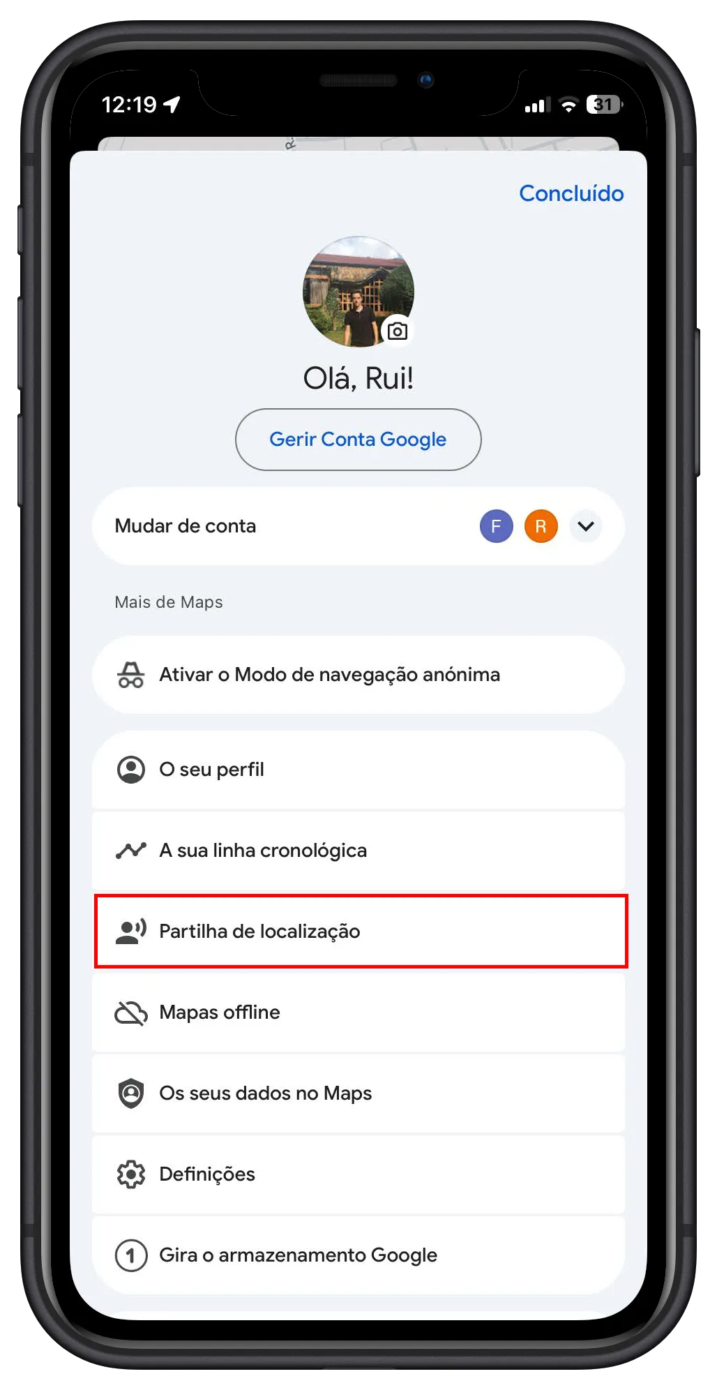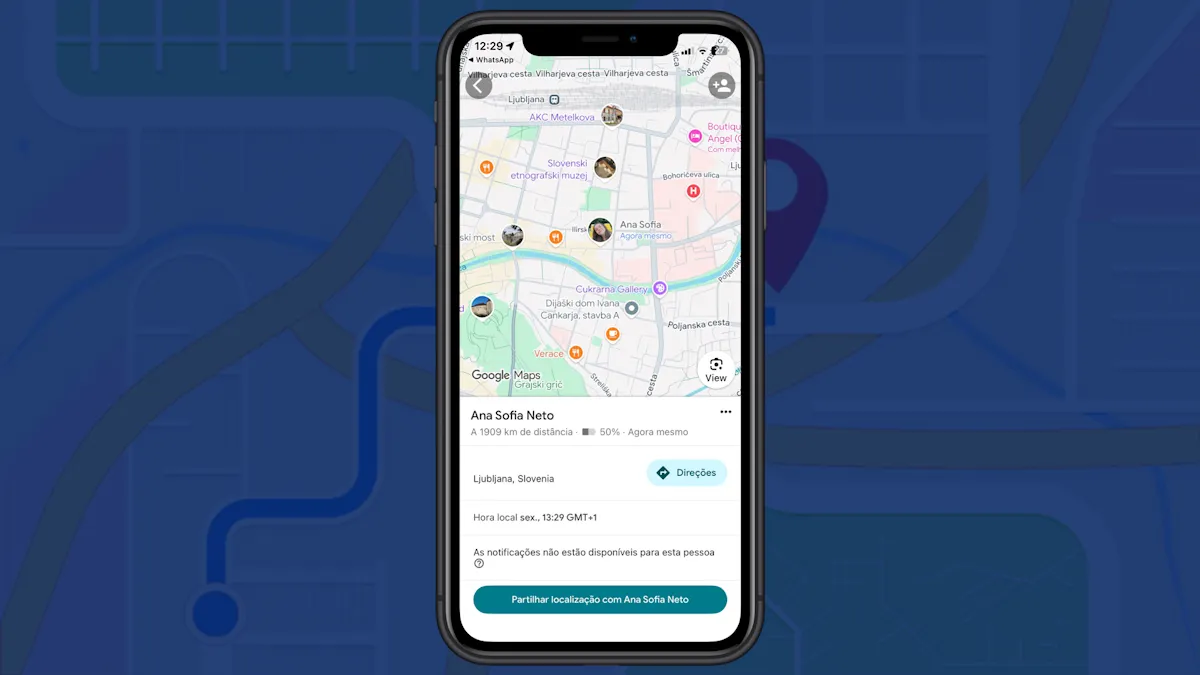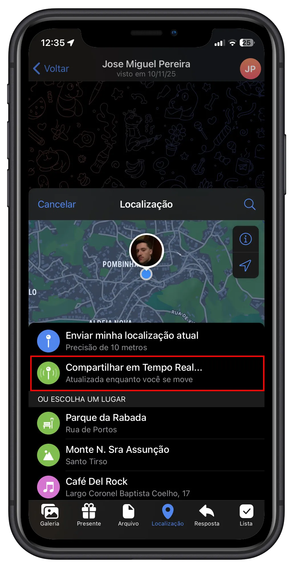 O destinatário verá a sua localização ao aceder à mesmo secção "Partilha de localização".