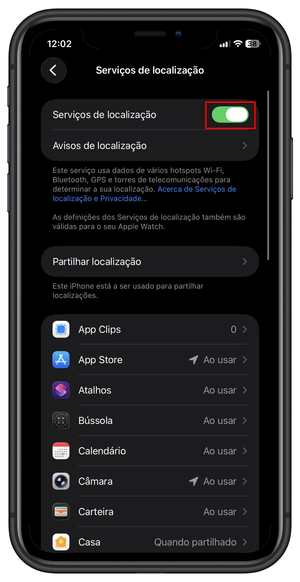 Esta é a definição principal que permite ao seu iPhone utilizar o GPS. Aceda a "Definições" > "Privacidade e segurança" > "Serviços de localização" e certifique-se de que o switch está ativado.