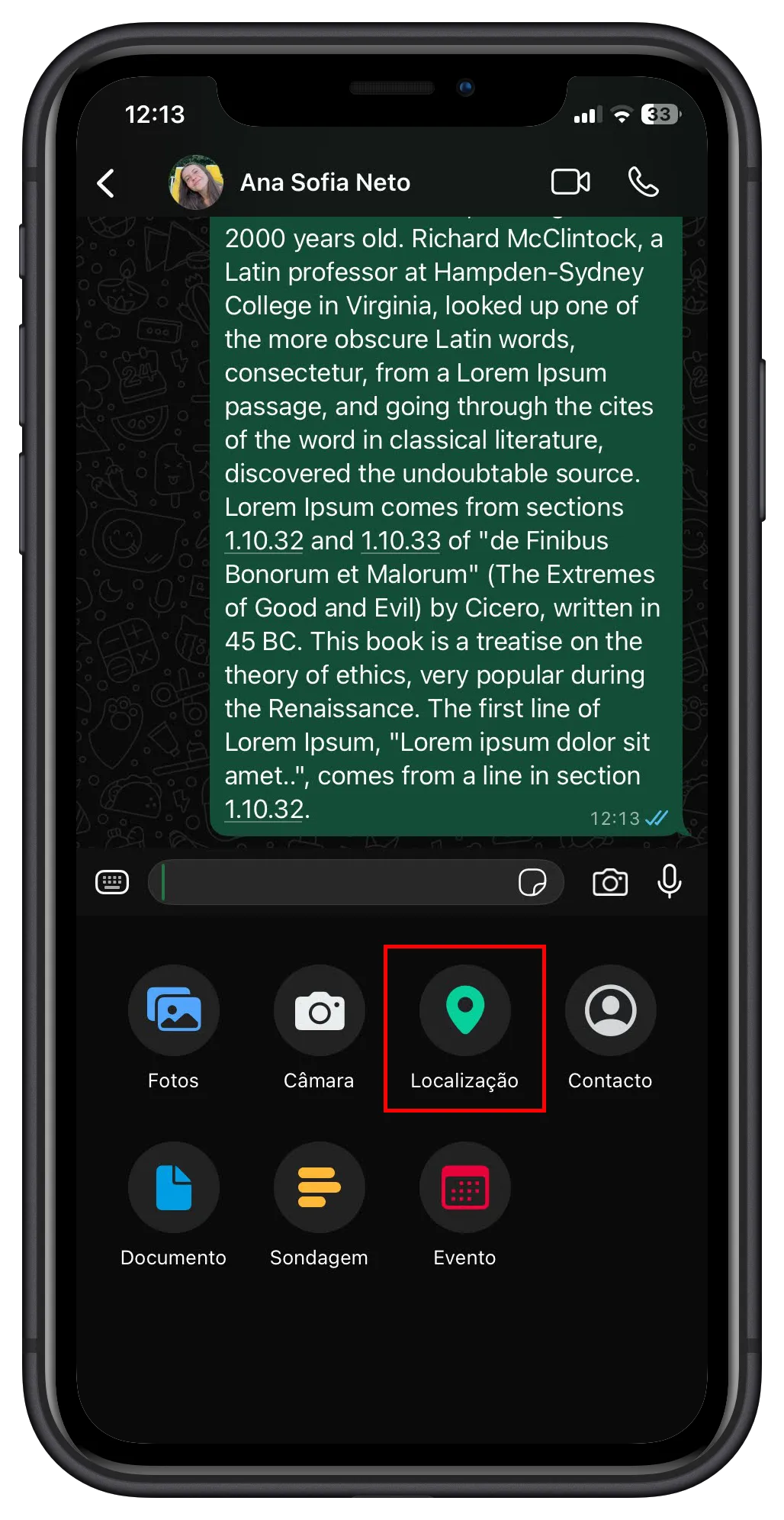 2. Clique no ícone de anexo (+) e selecione "Localização".