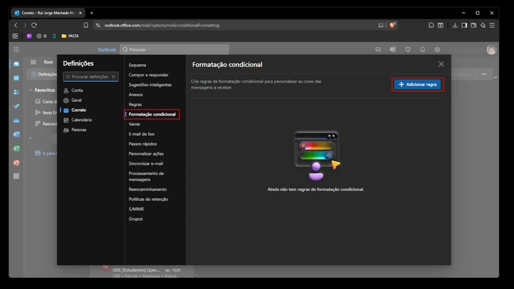 Pode repetir este processo para criar quantas regras de formatação condicional quiser, personalizando a sua caixa de entrada ao máximo.