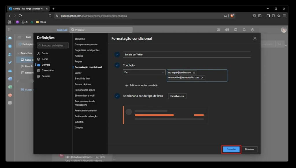 Aqui pode escolher a cor que quer que os emails correspondentes tenham. Imagine todos os emails importantes a aparecerem a vermelho vivo.