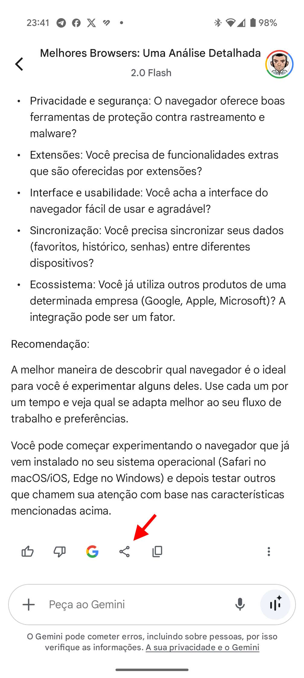 Para o fazer, basta interagir com a Gemini e descer até ao final da resposta. Aqui terá um conjunto de opções, entre elas a de partilhar. Bastará tocar no ícone certo e será crido um link público. Importa recordar que se o utilizador carregar uma imagem para uma conversa, esta ficará visível para quem aceder a essa partilha.