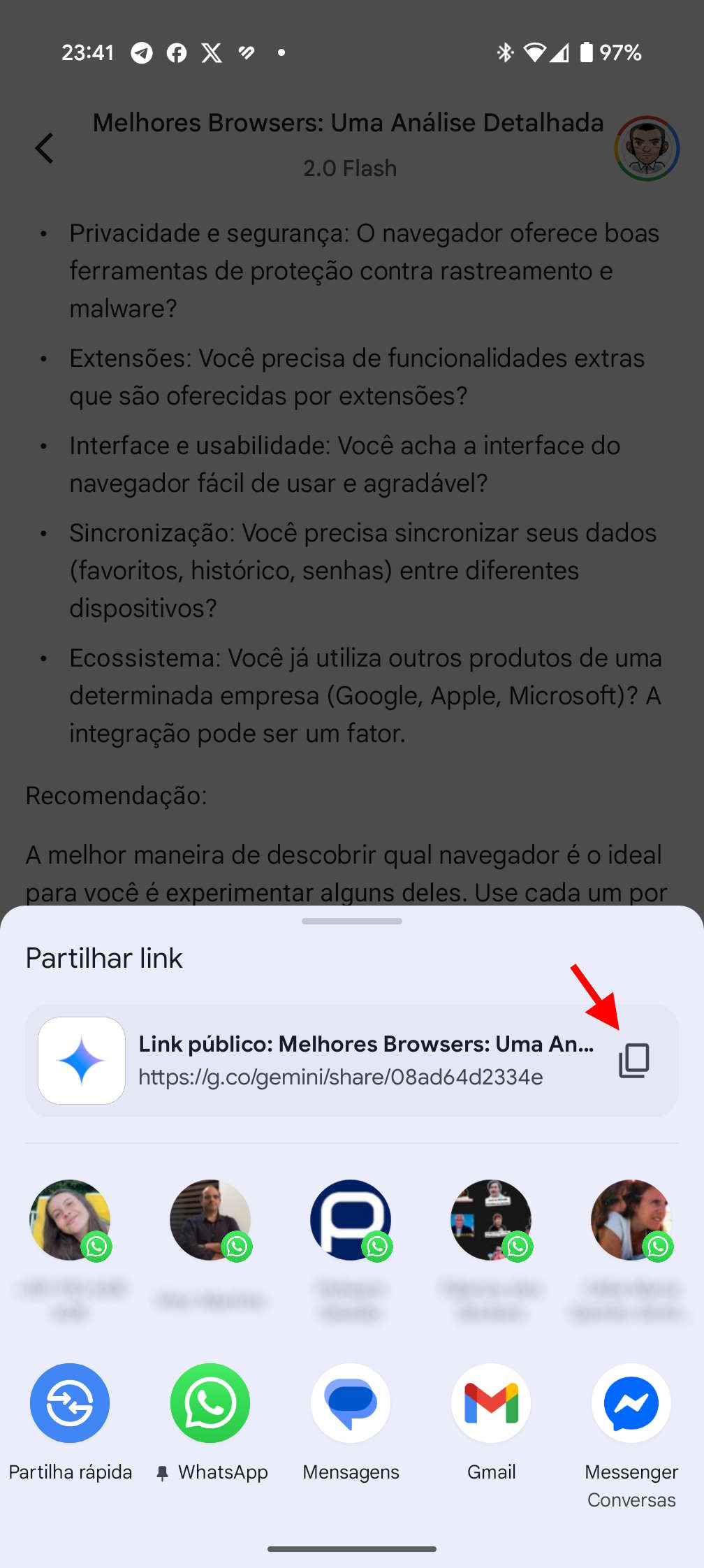 No passo seguinte, o utilizador terá acesso às suas opções de partilha. Estas vão ter um link direto, que pode ser copiado, a lista dos contactos mais frequêntes e a lista das apps mais usadas. Só precisa de escolher como ou com quem quer fazer a partilha. Nem todas as pesquisas no Gemini podem ser partilhadas se qualquer parte da resposta ou do chat tiver sido gerada com o Google Workspace.