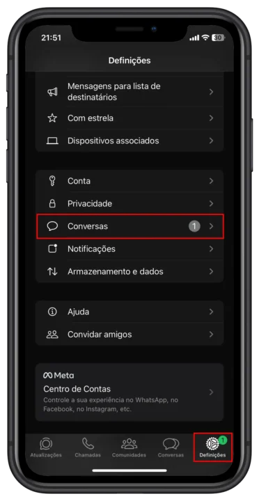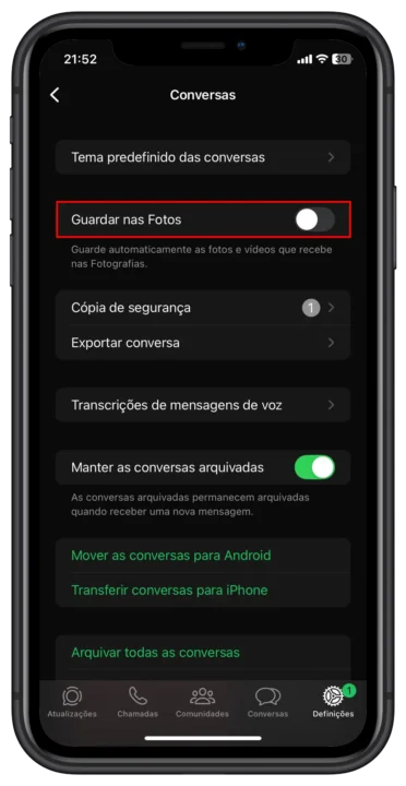 No iOS, em "Definições" > "Conversas", pode desativar a opção "Guardar nas Fotos". Isto impede que todas as imagens e vídeos recebidos no WhatsApp sejam duplicados na galeria do seu iPhone. Os ficheiros continuarão disponíveis dentro da aplicação.