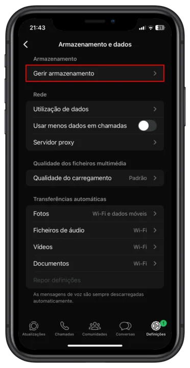 Para tal, siga estes passos: no WhatsApp, aceda às "Definições" > "Armazenamento e dados" > "Gerir armazenamento". Neste menu, a aplicação apresenta um relatório detalhado do espaço ocupado. As secções mais úteis são: