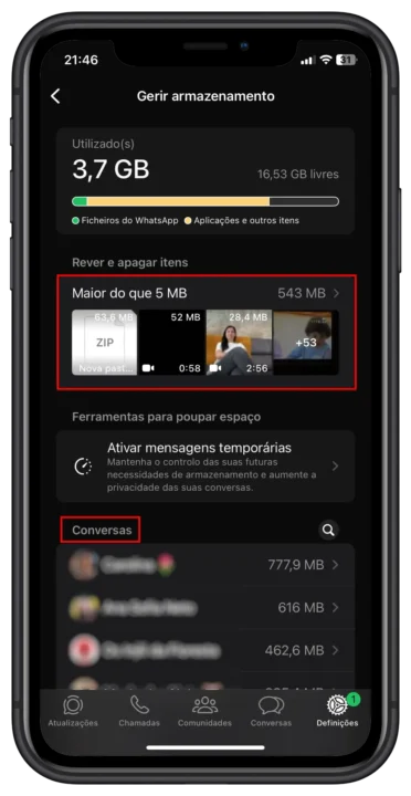 - Abaixo, a lista de conversas individuais, de grupo e canais é ordenada pelo espaço que cada uma ocupa. Ao selecionar uma conversa, pode ver os ficheiros por tamanho e eliminá-los seletivamente.