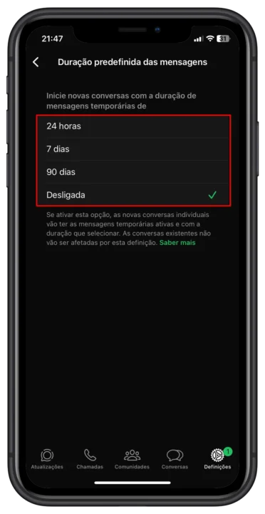 Nas suas conversas ou grupos, pode definir que as mensagens desapareçam após 24 horas, 7 dias ou 90 dias. Juntamente com as mensagens, os ficheiros multimédia associados também serão eliminados, libertando espaço automaticamente.