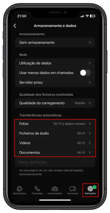 Em "Definições" > "Armazenamento e dados", pode controlar que tipo de ficheiros são transferidos automaticamente. Para um controlo máximo, defina todas as opções (fotografias, áudios, vídeos e documentos) para "Nunca", de modo a que só descarregue aquilo que realmente lhe interessa.