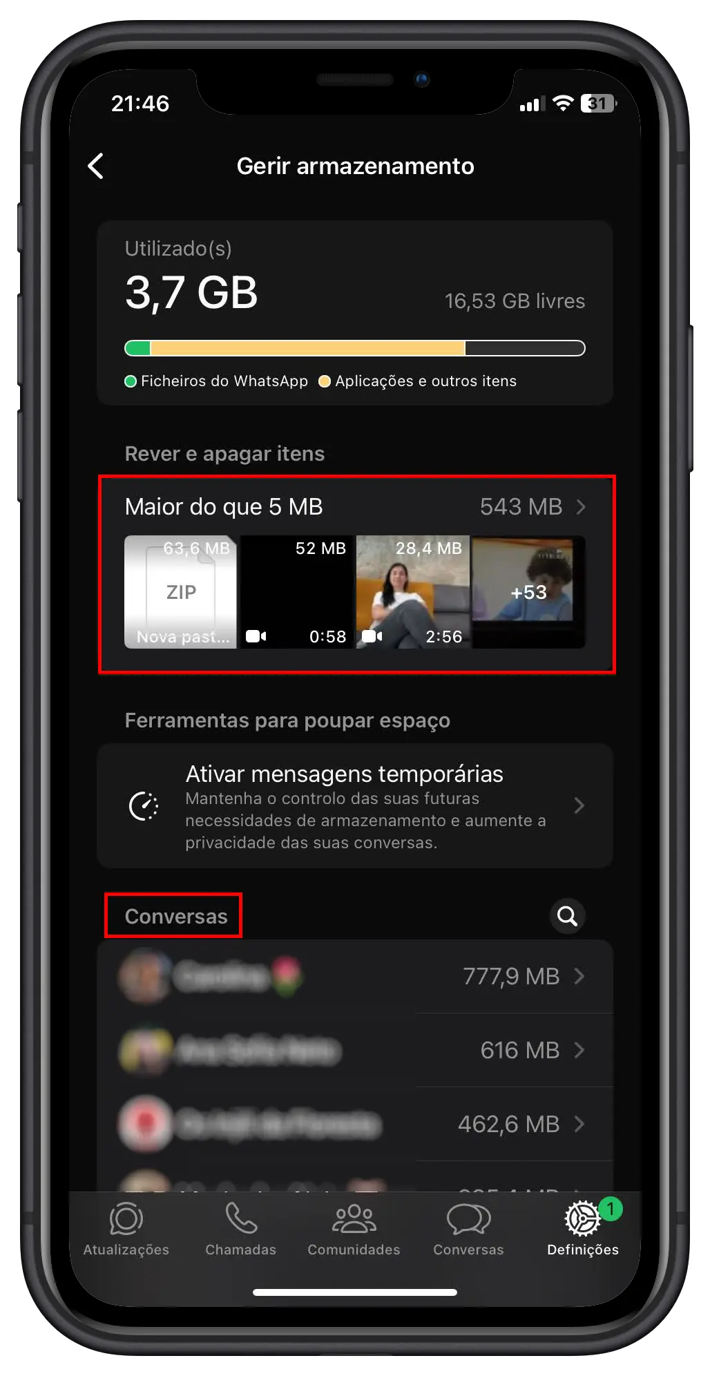 - Abaixo, a lista de conversas individuais, de grupo e canais é ordenada pelo espaço que cada uma ocupa. Ao selecionar uma conversa, pode ver os ficheiros por tamanho e eliminá-los seletivamente.