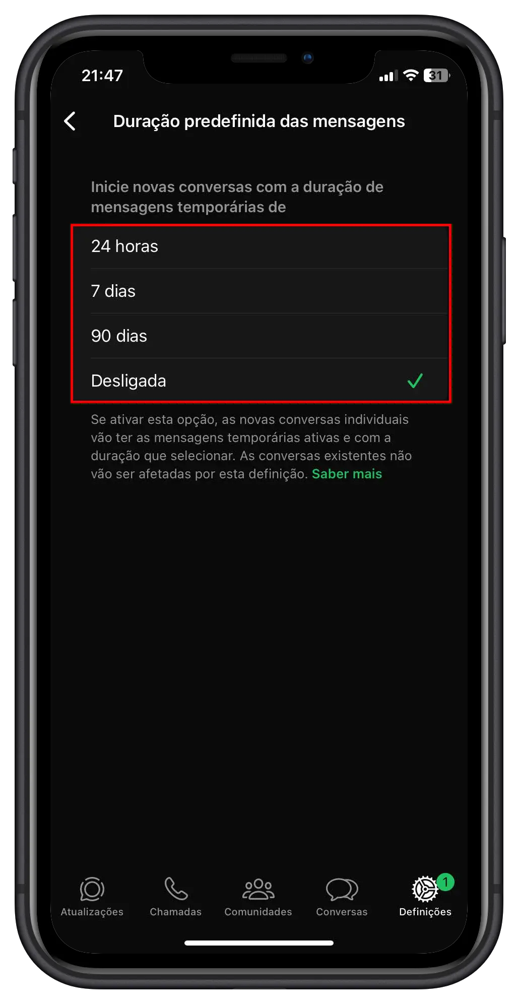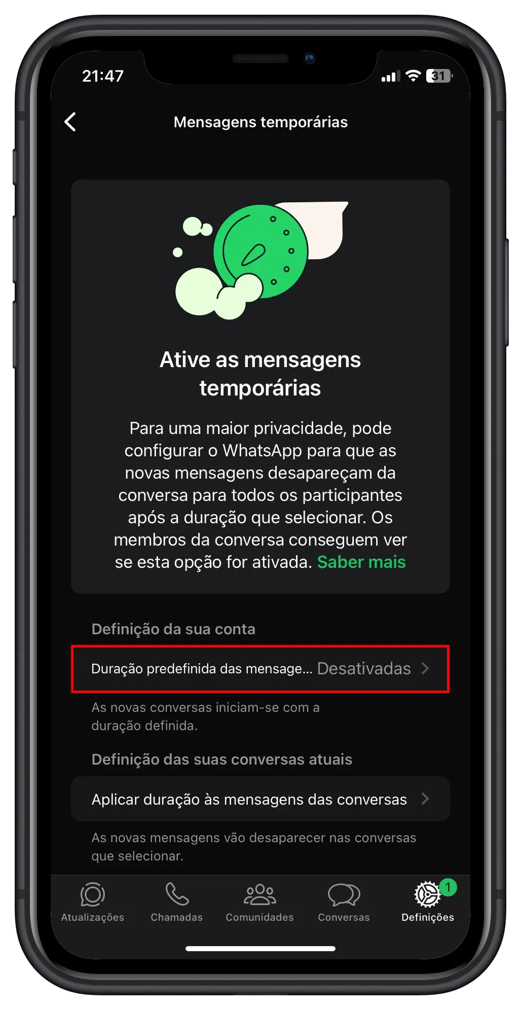 1️⃣ Ativar mensagens temporárias